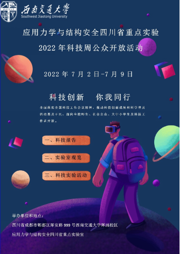 根据《四川省科学技术厅、中共四川省委宣传部、四川省科学技术协会关于举办2022年四川省科技活动周的通知》(川科奖[2022]3号)文件精神和要求,为全面落实全国科技工作会议精神,推动科技创新成果和科学普及活动惠及于民。2022年7月2-9日,西南交通大学应用力学与结构安全四川省重点实验室结合自身特色和资源,面向全校师生、大中小学生、科研院所工作者和社会公众举办了“科技创新,你我同行”为主题的科技周公众开放活动。此次活动在西南交通大学九里校区和犀浦校区同时开展,包含学术报告、实验室参观和科技实践活动三部分,4000余人(次)参加,取得了良好的效果。