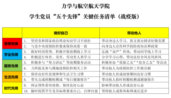 党委向全体学生党员发出了争做学习战疫“五个先锋”的通知,号召全体学生党员以身作则,发挥党员的示范带动作用;迎难而上,发挥党员的先锋模范作用;抓好学习,落实学院“五个先锋”关键任务清单,并制定了《学生党员“五个先锋”关键任务清单(战疫版)》,要求学生党员们在做好疫情防控的同时,要带头上好网课,同时带动身边同学学习战“疫”,共同进步。