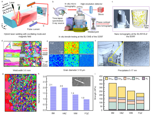 深入研究发现,细晶带内部的细小等轴非枝晶是以母材中高温稳定相经异质形核而成,适宜的温度梯度和熔池扰动共同决定了细晶带形成于HAZ区域。调节工艺参数能够改变细晶带的宽度,但无法完全消除细晶带。基于高分辨X射线原位多尺度关联成像技术,发现影响7050铝合金接头性能劣化的本质因素,探明了细晶带软化及沿晶失效机制,进而提出了一种全新的“激光扰动+磁场脉冲”联合制造策略,通过调控细晶带的区间分布,大幅提升了激光熔焊接头的强韧性,高于搅拌摩擦焊。相关成果以题为“Inhibiting weld cracking in high-strength aluminium alloys”发表在Nature Communications上,第一作者为西南交大牵引动力国家重点实验室胡雅楠博士(现为澳门六合彩开奖记录