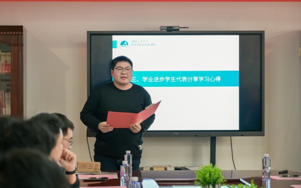 活动第三项,学业进步学生代表黄旭同学分享了自己的学习心得。黄旭同学首先对努力班全体老师与同学表示了感谢,接着说明了自己如何在努力班的同学和老师们的帮助下不断补上自己落下的专业知识最后成功出班的感想。