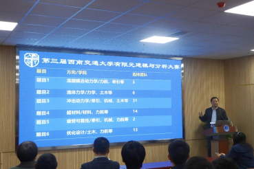副院长阚前华教授主持;研究生院副院长朱志武教授、李映辉教授、李相辉经理,西南石油大学土木工程与测绘学院朱一林教授等出席了颁奖典礼。朱志武教授代表研究生院致辞,表示比赛的选题切合实际,富有工程意义,对锻炼同学们的科研能力和解决工程实际问题的能力有重要意义;另外朱志武教授对同学们积极参赛的态度和优秀的表现表示了赞扬与肯定,同时对参赛作品中显露出的不足之处给予了客观的评价,敦促同学们严谨细心,保持学习心态,持续进步!