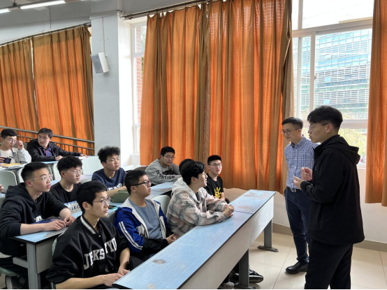 招聘会期间,作为工力2022-03班就业导师,陈鑫校友抽空来到教室与同学们进行了第一次线下会面。他向大家介绍了自己以及当时的室友本科学习生活情况和毕业去向,鼓励同学们学习好专业知识的同时要做好个人职业规划、提升个人综合能力,为以后的就业打好基础。班会最后,孔祥彬向陈鑫校友表示了感谢。