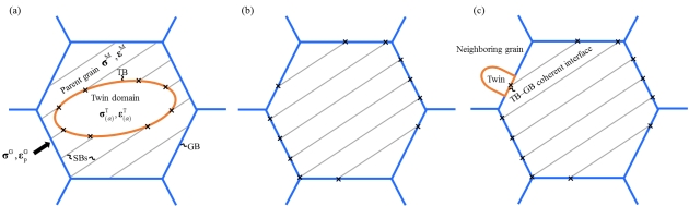 图2(a)孪晶界损伤示意图;(b-c)晶界损伤示意图