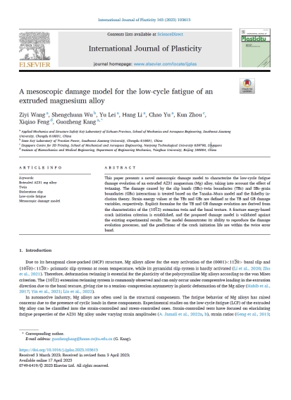 近日,我院博士生王子仪在塑性力学领域顶刊《International Journal of Plasticity》上发表了题为“A mesoscopic damage model for the low-cycle fatigue of anextruded magnesium alloy”的研究成果。康国政教授为通讯作者,合作者包括于超教授、吴圣川研究员、清华大学航天航空学院冯西桥教授、新加坡南洋理工大学周琨教授、北京大学工学院李航博士后和我院博士生雷宇。