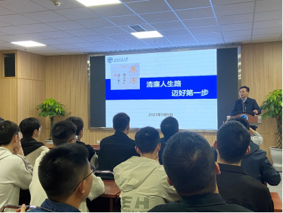 ,在学院学术厅为学院毕业生党员们讲授了一堂题为“清廉人生路,迈好第一步”的专题党课。党课由学院党委书记栗民主持,学院党委副书记、纪委书记孔祥彬,辅导员张容华和2022届毕业生党员们参加了本次党课学习。