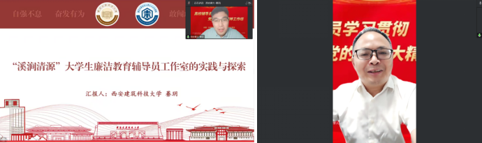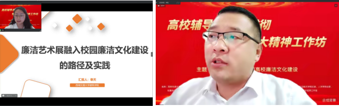 西南交通大学建筑学院辅导员奉天以“廉洁艺术展融入校园廉洁文化建设的路径及实践”为主题,介绍了学院围绕廉洁教育开展的一系列艺术展览活动。学院将美育协同的育人思路与学院学生特色相结合,将廉洁文化的教育目标融入到美育和专业课程的育人目标中,形成了以廉洁艺术展为载体的廉洁教育体系,为校园廉洁教育提供了方法和路径。西安建筑科技大学马克思主义学院党委书记宋阳进行了点评,他表示廉洁艺术展是一堂生动的廉洁文化课,能够让观展者在感受艺术魅力的同时,推动廉洁文化深入心灵,引导广大师生更加关心、关注和参与到廉洁文化建设中来,充分发挥了廉洁文化教育人、影响人和鼓舞人的重要作用。