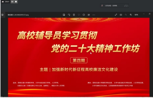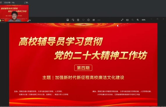 2023年6月3日,以“加强新时代新征程高校廉洁文化建设”为主题的高校辅导员学习贯彻党的二十大精神工作坊第四期在线上成功举办。工作坊由西南交通大学建筑学院、澳门六合彩开奖记录