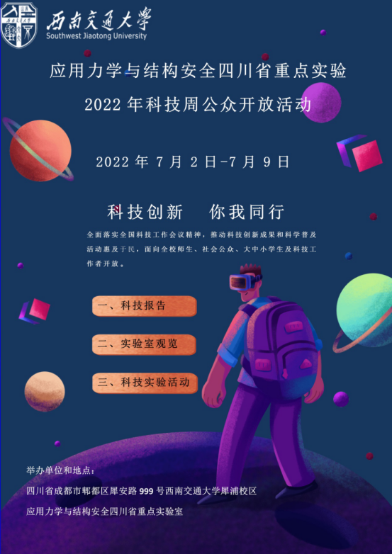 根据《四川省科学技术厅、中共四川省委宣传部、四川省科学技术协会关于举办2022年四川省科技活动周的通知》(川科奖[2022]3号)文件精神和要求,为全面落实全国科技工作会议精神,推动科技创新成果和科学普及活动惠及于民,西南交通大学应用力学与结构安全四川省重点实验室结合自身特色和资源,面向全校师生和社会公众举办“科技创新,你我同行”主题的科技周公众开放活动。现将科技周公众开放活动安排相关事宜通知如下: