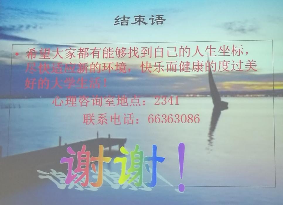 2016922日晚7点,为了让刚入学的新生更好地适应大学生活,一场以大学新生心理健康教育为主题的讲座于X4158如期举行,主讲人为心理中心高燕老师。