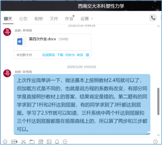 杨杰老师采用慕课自主学习和直播授课两种方式结合的教学方法,每周固定时间更新MOOC进度,并督促同学在直播上课之前自学;每周固定时间进行直播教学,主要以讲解思考题为主,鼓励学生动脑思考,将实际例题与理论知识相结合。杨老师很耐心,对于教学群里同学提出的问题都细心解答。