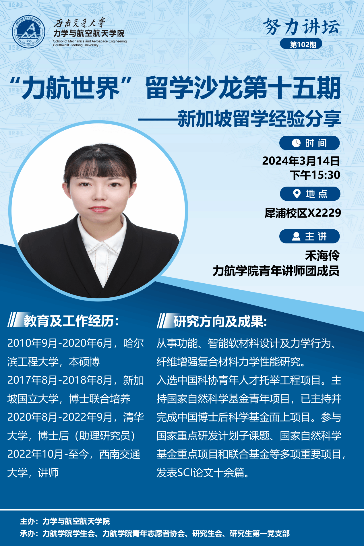 禾海伶老师曾于哈尔滨工程大学攻读硕博学位,攻读博士学位期间曾前往新加坡国立大学进行博士联合培养,于2022年来我院任教。本次活动,禾海伶老师以“新加坡求学经历分享”为题,主要从留学动机、新加坡介绍、新加坡国立大学介绍和留学申请流程等方面进行了分享。