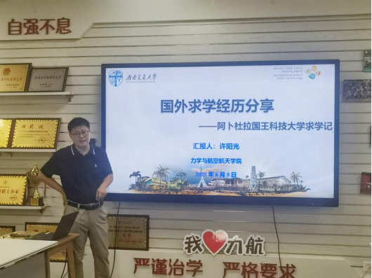 之后,许阳光老师向同学们分享自己在阿卜杜拉国王科技大学留学时的科研、生活经历,并建议同学们要提前规划自己的大学生活,思考自己未来职业发展,尽快明确自己是要做科学家还是工程师。