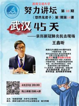 4月23日晚,《中国青年报》四川记者站站长、我校校友王鑫昕受邀作客“努力讲坛”第十六期,讲述了亲历武汉新冠肺炎抗击现场的45天。本次讲座由党委宣传部、澳门六合彩开奖记录-澳门六合彩开彩结果