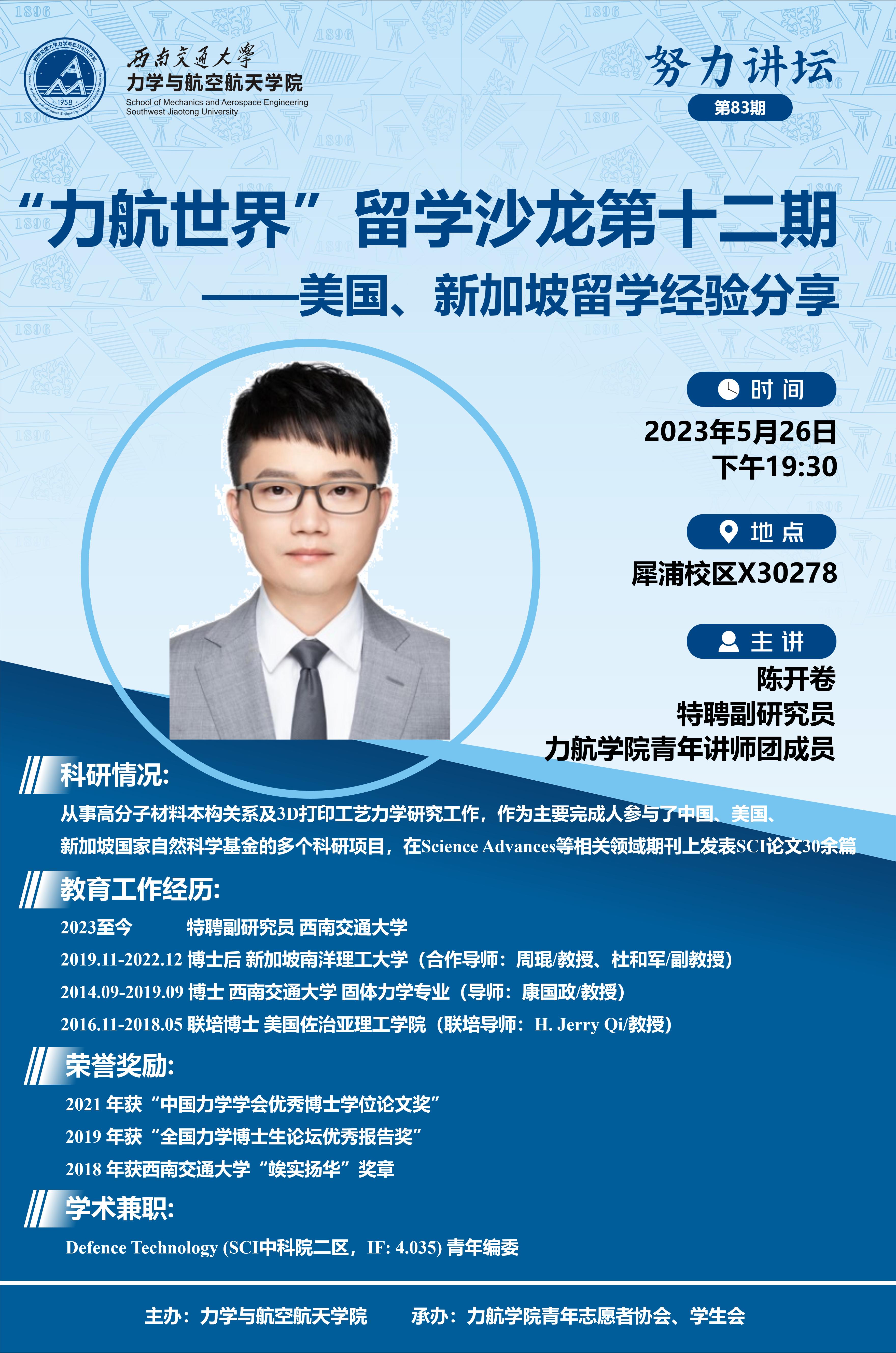 陈开卷老师于我院本科毕业后,跟随康国政教授攻读博士学位,期间赴美国佐治亚理工学院联合培养,毕业后在新加坡南洋理工大学担任博士后研究员,2023年到我院任教。本次活动,陈开卷老师以“美国及新加坡留学经验分享”为题,主要从科研心得、留学生活等方面进行分享。