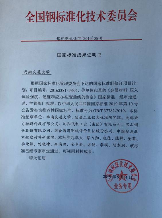 2019年8月30日,国家标准委员会正式发布了国家标准《金属材料压入试验强度、硬度和应力-应变曲线的测定》(GB/T 37782—2019)。具有我国自主知识产权的该项新标准,由西南交通大学澳门六合彩开奖记录-澳门六合彩开彩结果