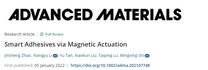 李翔宇教授与师明星教授领导的课题组最新科研成果“Smart Adhesive via Magnetic Actuation”在国际顶级期刊《AdvancedMaterials》(IF: 30.849)上在线发表。李翔宇教授和师明星教授为论文的共同通讯作者,第一作者为博士研究生赵晋生,共同作者有博士研究生谭宇、博士研究生刘晓坤和硕士研究生鲁太平,均来自澳门六合彩开奖记录