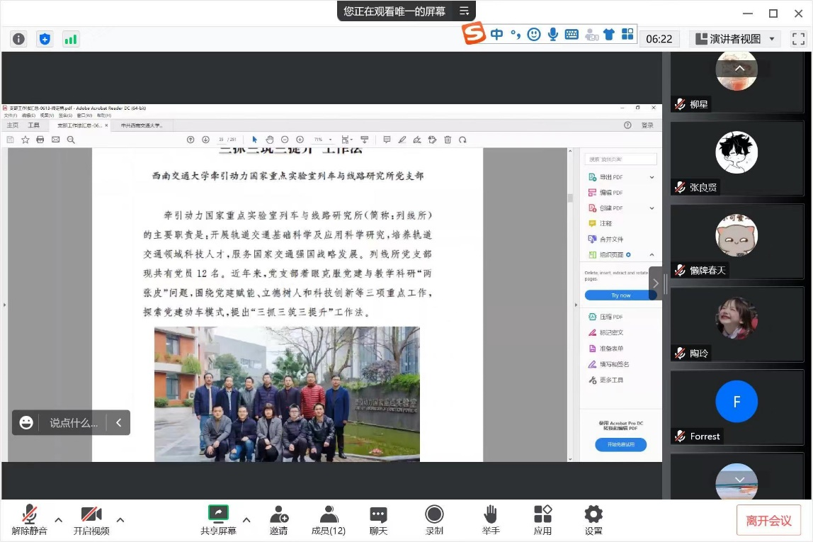 本次活动主要学习借鉴西南交通大学牵引动力国家重点实验室列车与线路研究所党支部“三抓三筑三提升”工作法,即抓支部规范化建设、抓师德师风建设、抓科研文化建设为切入点,通过筑牢战斗堡垒以提升支部政治活力,筑实育人平台以提升人才培养质量、筑建创新争先文化以提升科研成果质量,实现党建和教学科研工作深度融合同向同行。