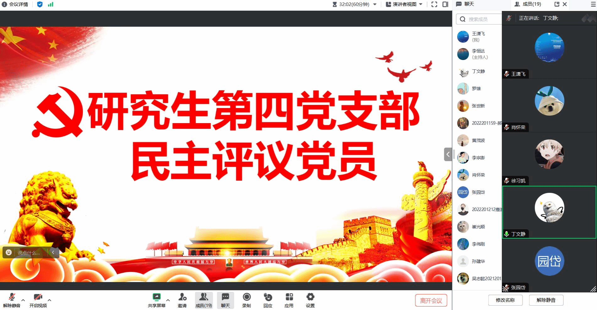 1月19日晚,研究生第四党支部在线上召开了2023年度组织生活会。会议由党支部宣传委员李恒达主持,支部全体党员参加了此次会议。