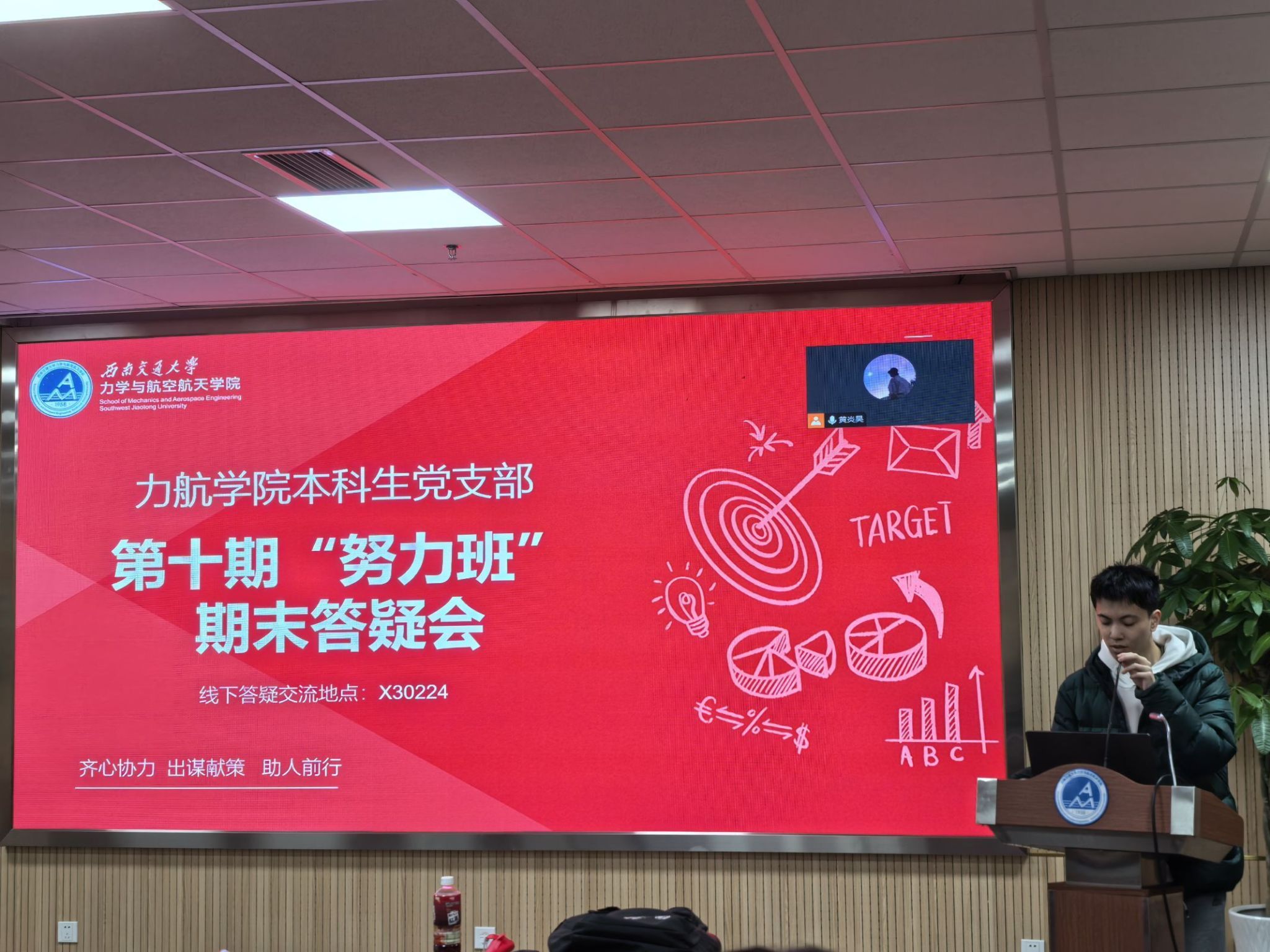 本科生党支部“砥力学霸团”黄炎昊、牛向前、徐锦程、赵昀雯、庞富官、赵宇翔和钱添翼等党员同志,特别邀请今年“竢实扬华奖章”获得者卓武同学共同举办期末考试考前经验分享会。为了方便广大同学参与,经验分享会以线上和线下方式同时开始。学霸团的同志和卓武同学从学习方法、时间管理、考试技巧和具体题目解答等多个方面分享自己的学习经验,无论是线下还是线上的同学都踊跃提问,学霸团和卓武同学都耐心地一一解答,现场气氛热烈而融洽。通过这次活动,广大同学收获了满满的干货,对期末考试有了更充分的准备和更坚定的信心。同时,这也彰显了本科生党支部对同学们学业发展的关心和支持,充分发挥了党员的先锋模范作用和优秀学生的榜样引领作用。