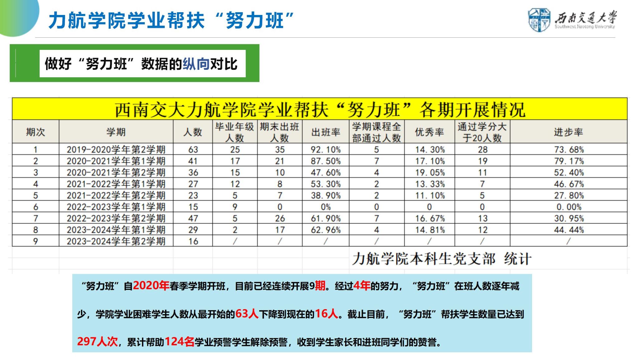 组建的一个虚拟班级,以帮助学习困难学生提升自我管理能力和自主学习意识、提高学生的学习效率与学习成绩为目的。目前,“努力班”已经持续开展至第十期。本科生党支部成立党员先锋队,常态化为“努力班”每个同学提供《力学秘笈》、开展个性化“一对一”、每周精品例题分享与讲解、期中考试前资料分享、期末考试前答疑等帮扶措施。四年来,努力班“努力班”帮扶学生数量已达到297人次,累计帮助124名学业预警学生解除预警,出班率达到65.69%,进步率达到84.60%。