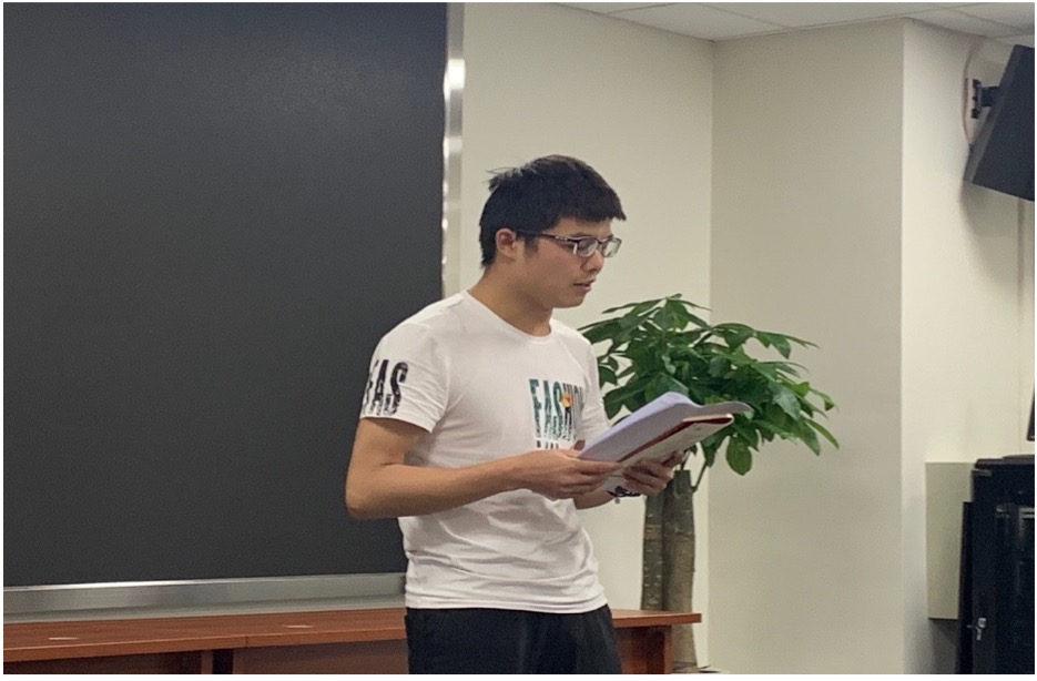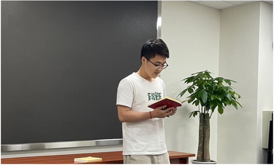 研究生第二党支部程一晋同学分享了毛泽东的七言律诗,诵读了《七律·人民解放军占领南京》一诗,讲述了中国人民解放军渡江解放南京的革命故事。