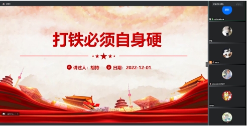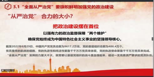 首先,胡持同志以“四个全面”中的“全面从严治党”为切入点,作了题为“打铁必须自身硬”的主题报告。习近平总书记在党的二十大报告中强调,坚定不移全面从严治党,深入推进新时代党的建设新的伟大工程。胡持同志详细解读了二十大报告中有关全面从严治党的内容,并结合力学的学科特点,以“力”的大小、方向、作用点三要素为喻,深入浅出地讲解了党的反腐败斗争的力度、目标和对象。