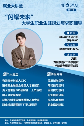 “力久弥新,航宇未来”生涯咨询室联合外国语学院、集成电路学院,在X30224举办了“闪耀未来”大学生职业生涯规划与求职辅导讲座。本次讲座邀请了学院优秀校友冯超作为主讲嘉宾,为三院学子们提供了宝贵的经验和指导。