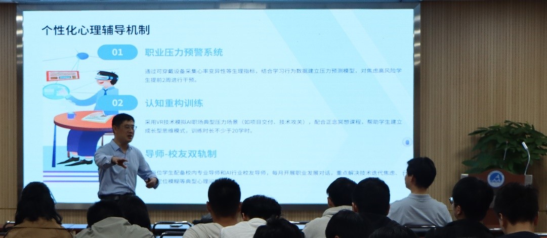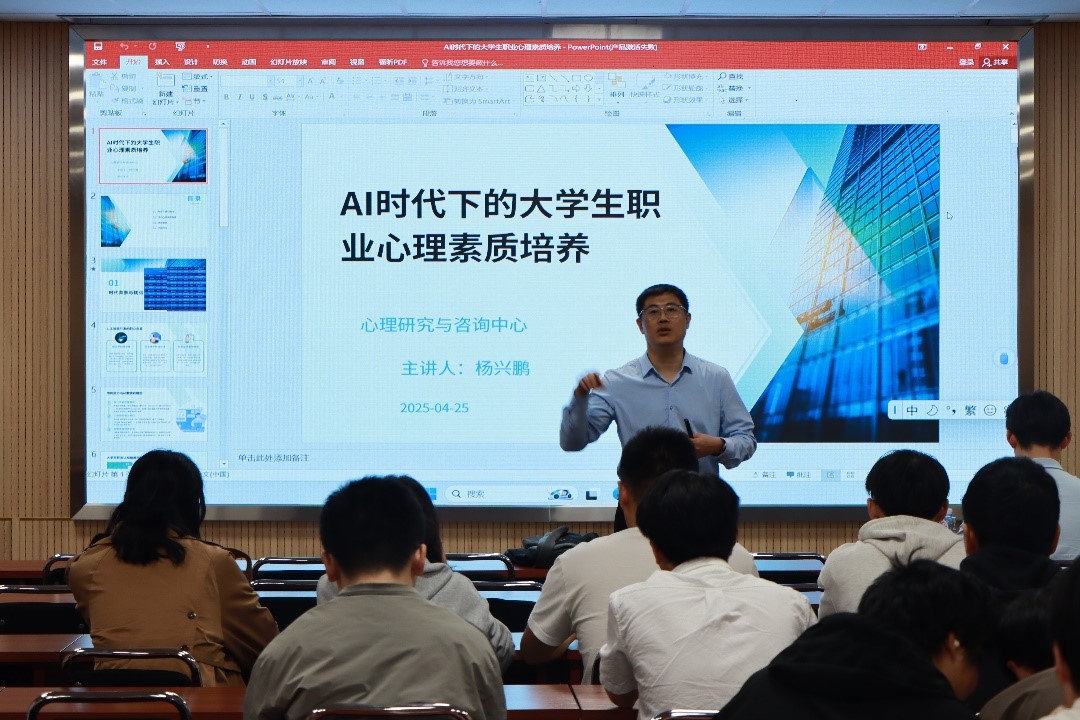 杨兴鹏老师以生动活泼的开场,通过心理学基础知识的科普,引领同学们进入心理健康领域。他借助真实案例和视频,详细讲解了AI时代对学生们日常生活的影响和适应AI时代所需要的核心心理素质。