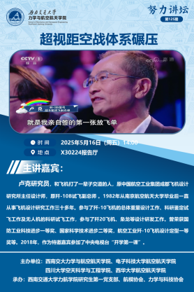 516日下午,中国航空工业集团成都飞机设计研究所研究员、航空专家卢克受邀到学院X30224报告厅作题为《超视距空战体系碾压》的专题讲座学院党委书记栗民、院长李翔宇教授、党委副书记孔祥彬及我院和电子科技大学航空航天学院、四川大学空天与工程学院、西华大学航空航天学院百余名学生参加讲座
