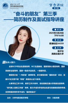 特邀信息学院杨子仪老师在犀浦校区X4359为我院大三本科生及研二研究生带来了一场主题为“简历制作及面试指导”的“奋斗的朋友”就业深造服务计划专题讲座。讲座聚焦学生需求,系统性地从时间规划、简历撰写到面试技巧进行了经验分享,干货满满。