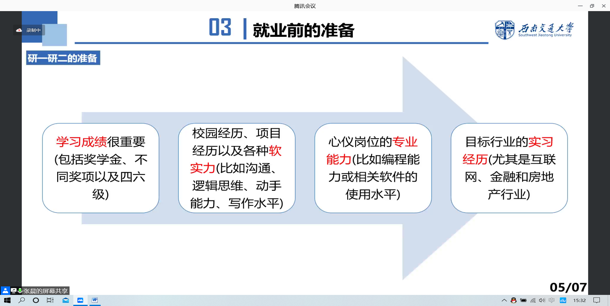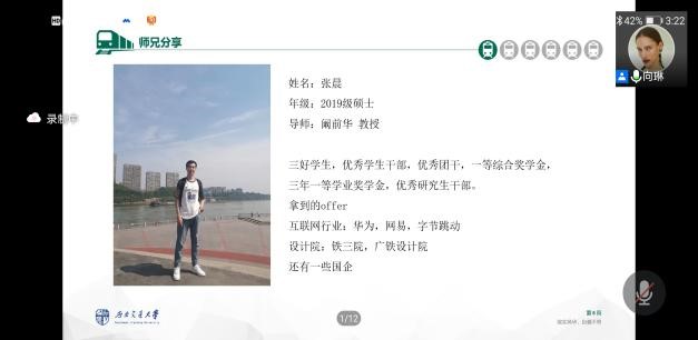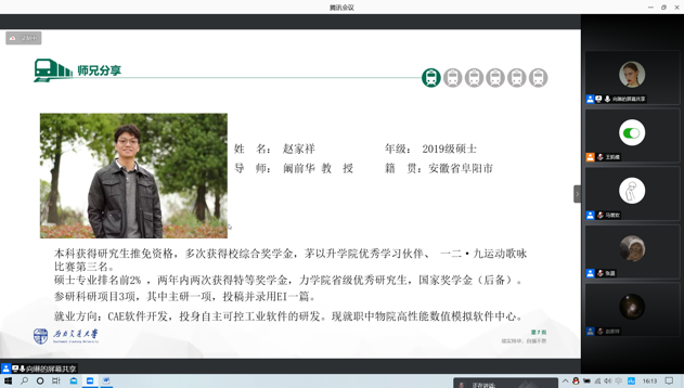 接着,2019级硕士生赵家祥从科研和就业两方面进行了经验分享。他认为,科研重要的是要主动和保持良好的心态,就业则应当多做调研,扩大将来的择业范围。