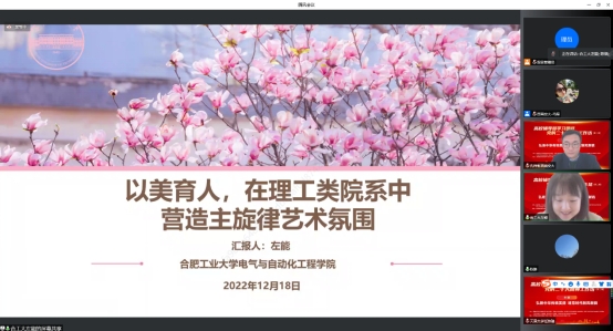 合肥工业大学左能老师作了题为“以美育人,在理工类院系中营造主旋律艺术氛围”的报告,介绍了学院以红色文化、中华民族文化教育为要素,以校园原创艺术作品产出为特色渠道,提升美育育人效果的方式方法。她分享了学院打造美育基地、创建“声”动斛兵工作室,开展“熠熠书香”读书笔记展评、爱国主义歌曲翻唱、红色音乐小课堂等特色活动的特色经验做法。天津大学生命学院党委副书记尚洁做了点评,她认为合肥工业大学的美育做法真正的做到了深入人心,以讴歌先进典型、赞美激扬青春为重点,形成了多首原创歌曲、翻唱歌曲、改编歌曲、校园MV等,以学生喜闻乐见的方式弘扬了主旋律。