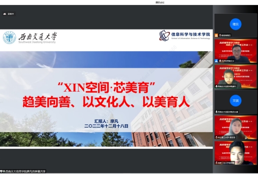 西南交通大学廖凡老师作了题为“‘XIN空间·芯美育’趋美向善、以文化人、以美育人”的报告,介绍了学院将美育融入到德育、智育工作,延伸到宿舍、楼宇空间,打造 “XIN空间·芯美育”品牌系列活动,详细介绍了品牌打造的四条路径:节日植入弘扬传统美、活动植入体现艺术美、文化软植入彰显人文美、专业软植入展示专业美。华东理工大学艺术学院党委副书记王珊进行了点评,她认为西南交通大学生动地展现了理工类高校在加强和推进美育教育中的举措与成效,体现了科学与艺术相结合的理念。科学和艺术可以相辅相成,加强高校美育教育,有利于促进理工类高校的学生在学习生活中强化文化主体意识,推动广大青年学子树立纯真向善审美观,构建美好心灵和健全人格。