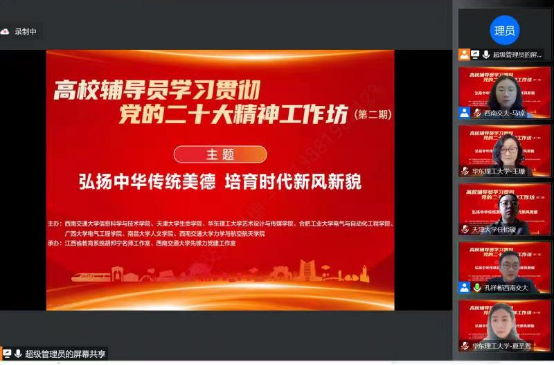 以及南昌大学人文学院、天津大学生命学院、华东理工大学艺术设计与传媒学院、合肥工业大学电气与自动化工程学院、广西大学电气工程学院共同主办,江西省教育系统胡邦宁名师工作室、西南交大先锋力党建工作室承办。论坛通过腾讯会议线上形式举行,200余名高校学生工作者参加了工作坊。工作坊第一阶段由西南交大孔祥彬主持,第二阶段由西南交大马琼主持,南昌大学胡邦宁做了总结点评。
