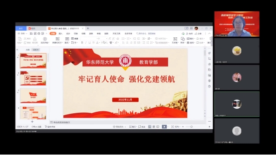 最后,教育部中国大学生在线、高校思政网副主任姬琳对本次工作坊进行了总结点评。她认为本次工作坊非常成功,并强调:所有的学习贯彻都要归结到落实上,我们的交流分享也应该转化成我们引导学生党员、教师党员在日常生活中干实事、求实效的指引;要全面领会党的二十大精神,努力使学习成果转化成实际行动的思想动力,真正做到学而信,学而用和学而行。