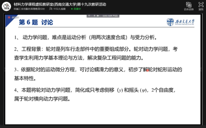 葛玉梅教授为大家进行了逐题详细讲解,从题目的命题思路,考察点,易错点,以及不同求解办法的难易程度等角度,详细剖析了每一道题目。此次竞赛的两道基础题目分别考察学生的静力学知识与动力学知识,重点考察学生对理论力学基本概念与求解技巧的掌握与应用。而提高题则结合了西南交通大学轨道交通的特色,以列车轮对的运动为背景,考察学生用基本力学知识解决复杂工程问题的能力。