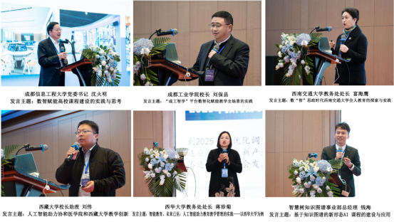 在研讨会上半场中,成都信息工程大学党委书记沈火明、成都工业学院校长刘保县、西南交通大学教务处处长富海鹰、西藏大学校长助理刘伟、西华大学教务处处长蒋珍菊、智慧树知识图谱事业部总经理钱海六位嘉宾依次发言,分别围绕“数智赋能高校课程建设的实践与思考”、“‘成工智学平台’数智化赋能教学全场景的实践”、“数‘智’思政时代西南交通大学全人教育的探索与实践”、“人工智能助力协和医学院和西藏大学教学创新”与“人工智能助力教育教学管理的实践——以西华大学为例”、“专业图谱服务专业发展的实践”六大主题展开探讨。
