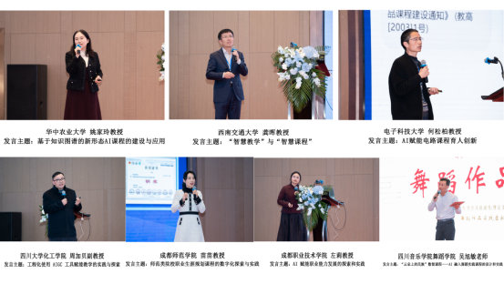 下午时分,华中农业大学姚家玲教授、电子科技大学何松柏教授、西南交通大学龚晖教授、四川音乐学院舞蹈学院吴旭敏老师、成都职业技术学院左莉教授、成都师范学院苗苗教授、四川大学化工学院周加贝教授从技术革新、理念优化、方法提升上精准突破传统桎梏,多维度深刻剖析AI与智慧课程内涵。