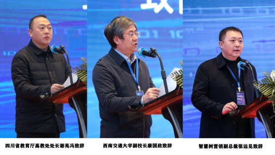开幕式致辞中,四川省教育厅高等教育处处长谢亮冯、西南交通大学副校长康国政、智慧树营销副总裁张远见先生依次发言。谢亮冯处长聚焦于“数智赋能高等教育”主题,从省教育厅支持高教创新改革的举措与建议方面给予了指导,充分肯定了数智化赋能高教革新的重要性与可行性,为整场会议锚定了“智教”基调;康国政副校长从西南交通大学着力推动智慧教育的理念与路径方面进行了分享,我校将继续秉持开放、合作、创新的精神,与参会各位同仁一道,共同推进人工智能与高等教育的深度融合;张远见先生从业界与高校共建共促优质资源创新方面畅谈了规划,引起与会者共鸣。