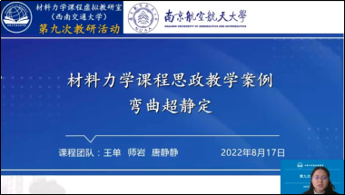 最后,王单副教授以梁的超静定弯曲章节为切入点,为虚拟教研室老师们展示了材料力学课程思政教学案例。由我国航空事业发展过程中遇到的变速风场系统中风速的控制过程中的可变截面喷管控制问题中,凝练出了梁的超静定问题。引导学生从复杂工程问题中简化出力学基本模型,在学习过程中锻炼学生的辩证思维能力,同时培养学生独立自主解决实际问题的能力。